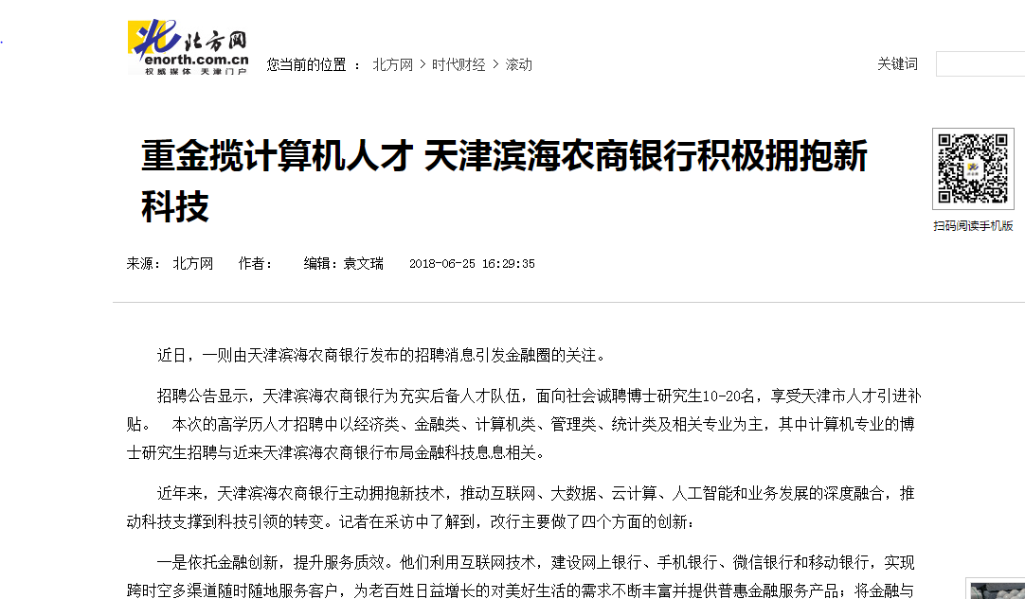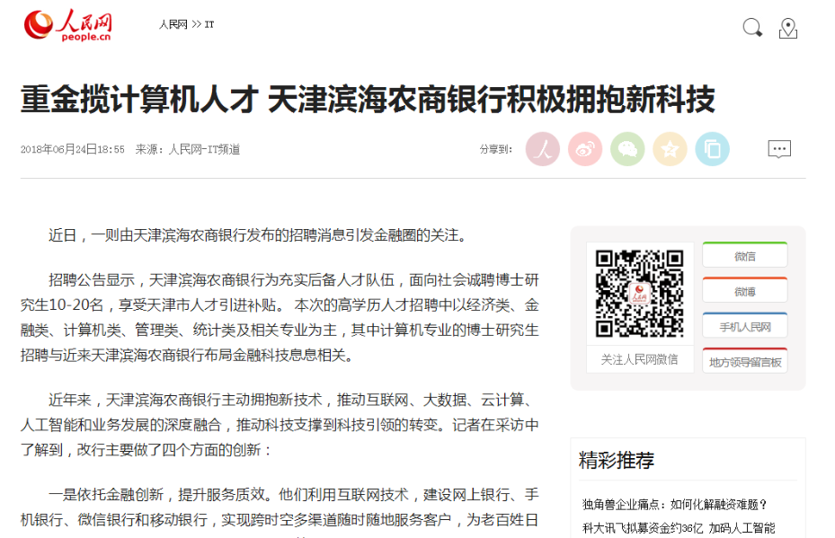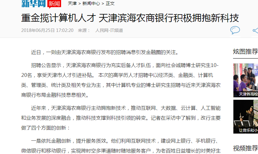 多家媒体刊发《重金揽计算机人才 天津滨海农商银行积极拥抱新科技》