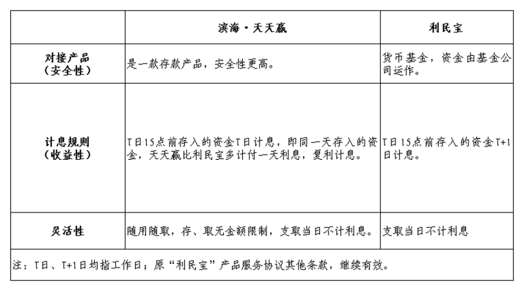 尊敬的客户: 根据中国证监会、中国人民银行《关于进一步规范货币市场基金互联网销售、赎回相关服务的指导意见》的相关规定,我行对利民宝产品业务做出相关调整: 一、我行自2018年7月1日起停发四海通e芯利民宝卡,同时,暂停四海通e芯利民宝卡、四海通e芯薪金卡、微银行二类账户利民宝产品的签约功能。 二、我行将于2018年7月2日起对存量“利民宝”产品分批次进行升级转换,转换后的产品名称变更为“滨海·天天赢”, 该产品对接我行活期类结构性存款,安全性更高,流动性更强。 三、“滨海·天天赢”产品以为客户提供更好的服务为目标,完善了产品设计,详情如下: